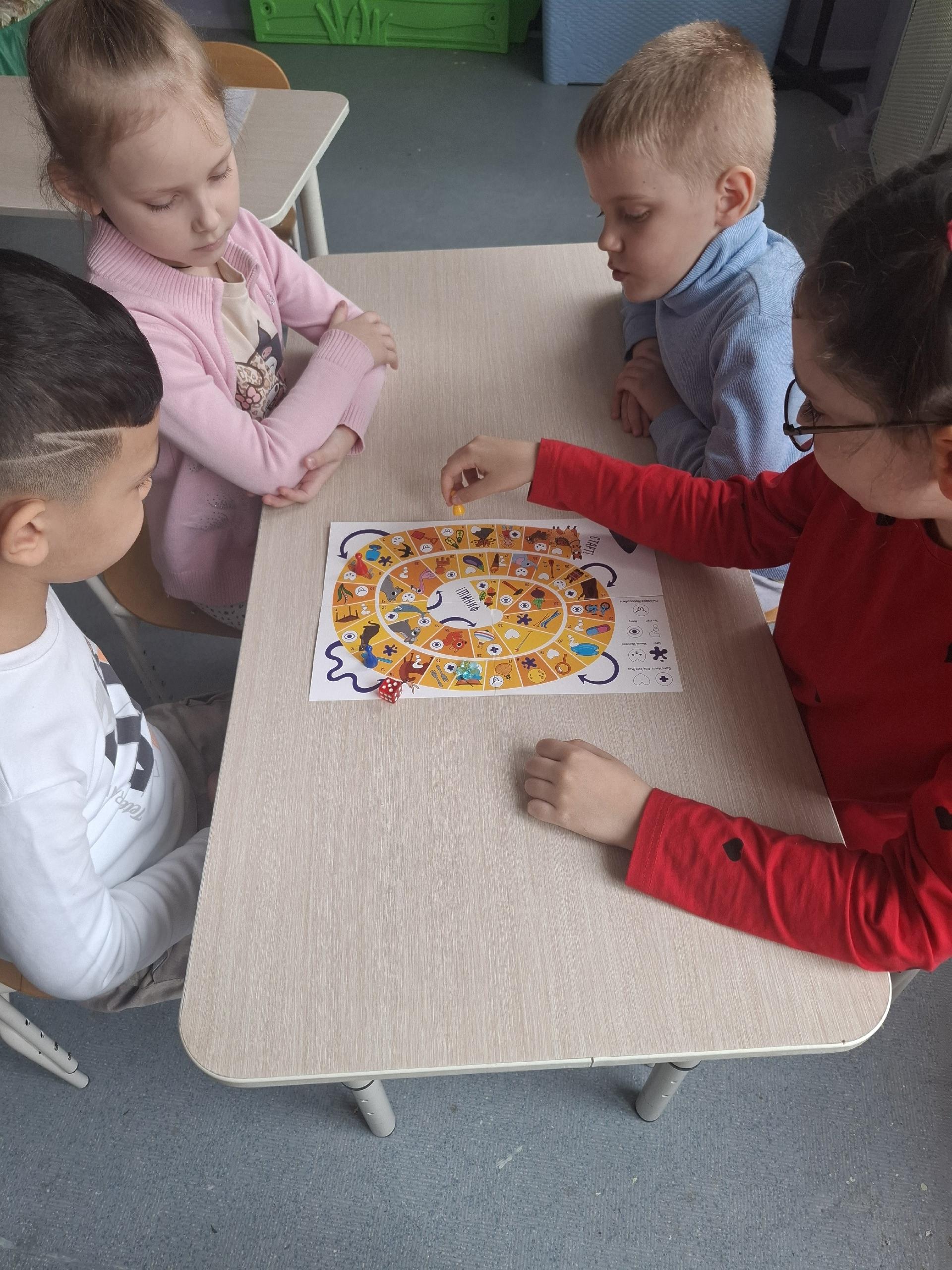 В подготовительной школе группе 12 дети начали изучать новую тему. Выделяем звук Р среди других звуков, определяем место звука в слове, обводим по точкам букву Р. Играем в настольно-печатные игры с кубиком. Игра направлена на развитие речи детей. Дети передвигают фишку и выполняют необходимое задание по соответствующим символам: один-много, мой-моя-мое, цвет, живое-неживое, что это?, я вижу, съедобное-несъедобное.